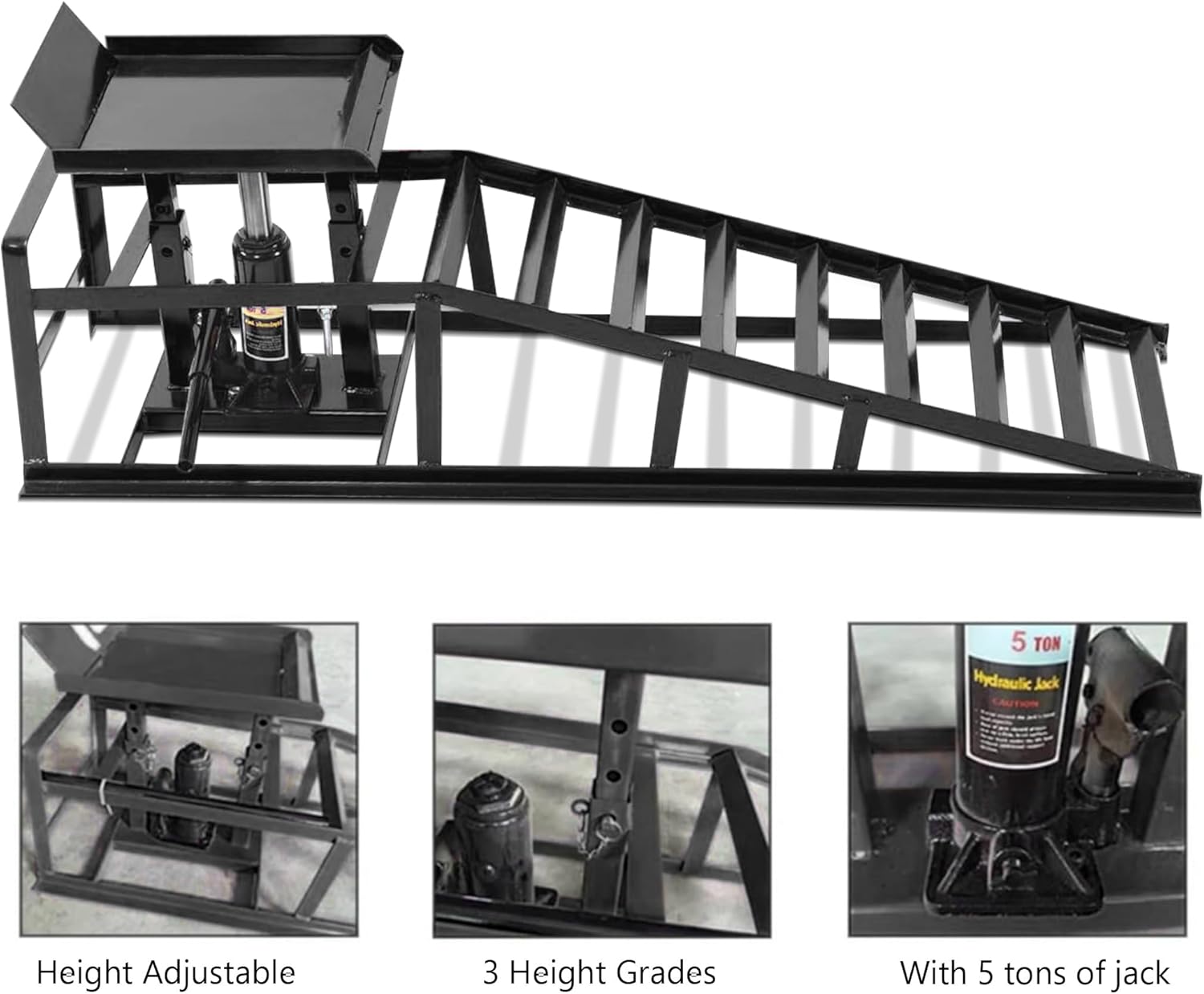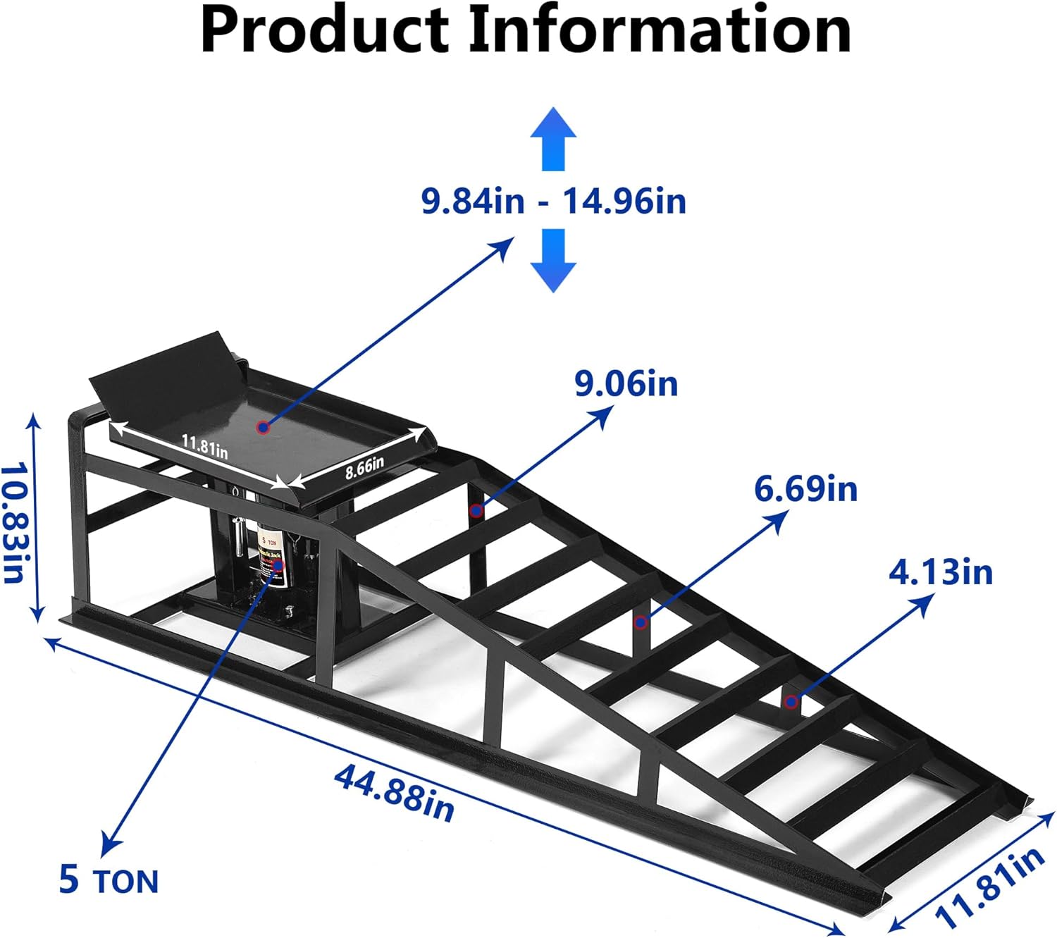 - Adjustable: Hydraulic car ramp lifts 11,060 lbs; height of hydraulic section adjustable from 9.84-14.96 in