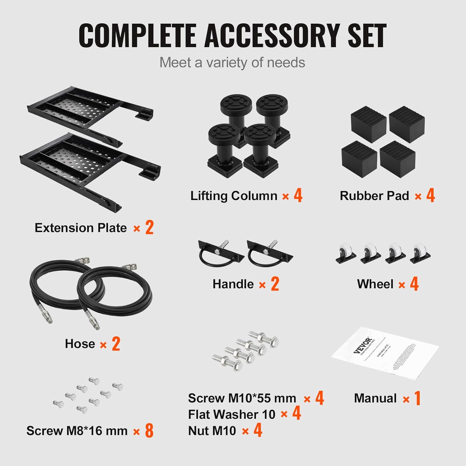 - Comprehensive Accessories: Your purchase comes complete with a comprehensive set of accessories, including 4 rubber pads, 4 lifting columns, 2 hoses, 2 extension plates, 2 handles, 4 casters, 8 hex bolts (M8 x 16mm), 4 hex bolts (M10 x 55mm), 4 flat washers, 4 hex nuts (M10), and a manual. Everything you need for effortless auto lift use and setup is included.